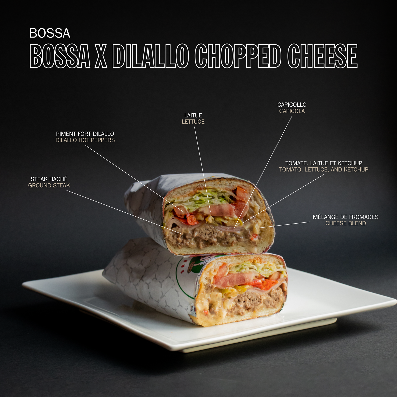 BOSSA X DILALLO Chopped Cheese by BOSSA: Get ready for a flavor explosion with this ground steak burger, featuring a melty cheese blend, fiery Dilallo hot peppers, and savory capicola. It’s topped with fresh tomato, lettuce, and a splash of ketchup.